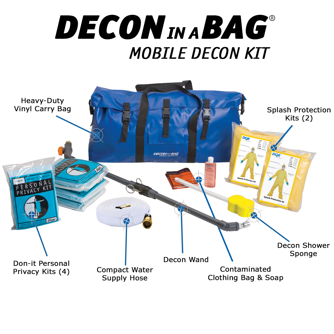 Each decon kit contains all the necessary equipment for simple, yet effective decontamination. In general, removing and bagging the victim’s clothing removes over 80% of the contaminants. With Decon in a Bag, you have all the supplies to perform gross field decontamination in a convenient portable vinyl bag.