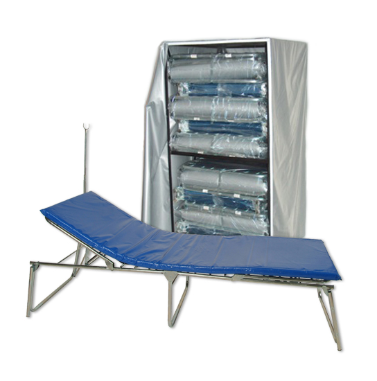 The mobile cart holds the 10 beds, has attached swivel wheels, and fits through standard hospitals doors. The Deluxe Adjustable Bed is the most useful bed for medical care. It can easily be adjustable to 4 headrest and 4 leg positions.