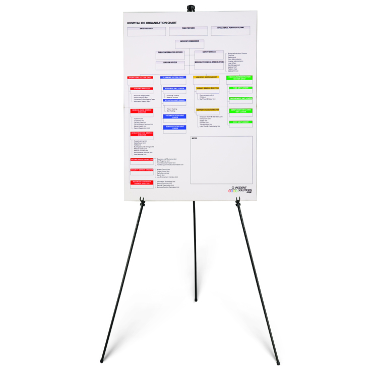 This quick deploy easel is configured to display the following hospital dry erase boards and easel pads: HICS 76 Position HIMT Chart – Dry Erase (IC2001), HICS 26 Position HIMT Chart – Easel Pad (IC2006), HICS 26 Position HIMT Chart – Dry Erase (IC2007), HICS 17 Position HIMT Chart – Dry Erase (IC2008).