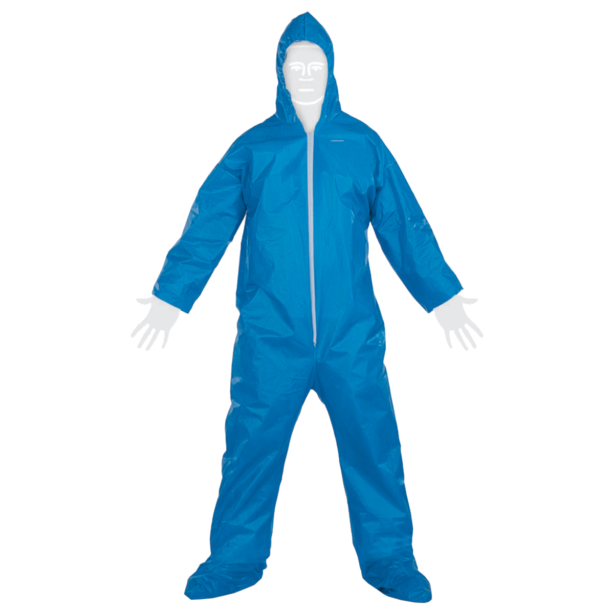 Ideal for training use, this inexpensive and reusable hooded suit with attached booties provides splash protection for wet training drills and gives users the feel of full personal protective equipment.