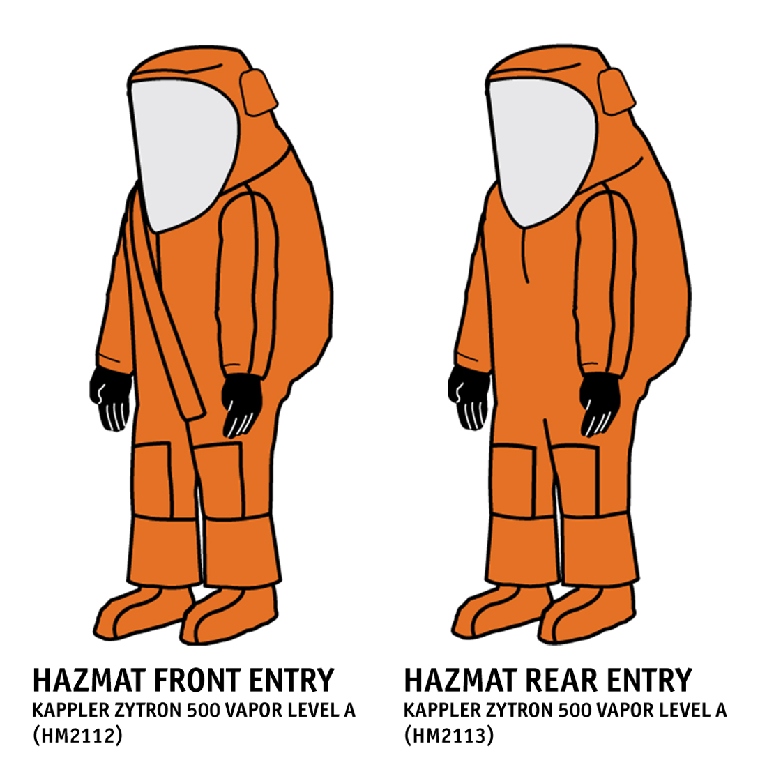 These fully encapsulated HazMat suits are available with front or rear entry versions and are in two colors to support situations that require discretion (Charcoal) or high visibility (Hi-Viz Orange). Kappler chemical suits have a ChemScan® label to quickly see if the garment is appropriate for the current response challenge. Suits for Level A HazMat suit training are available here.