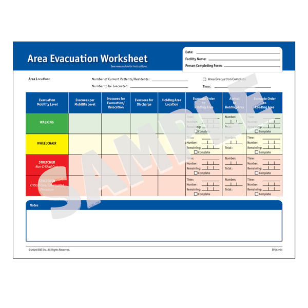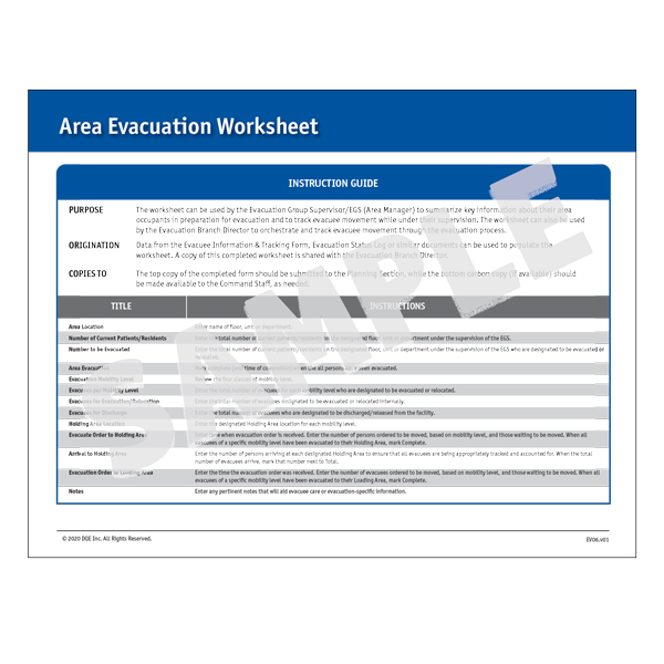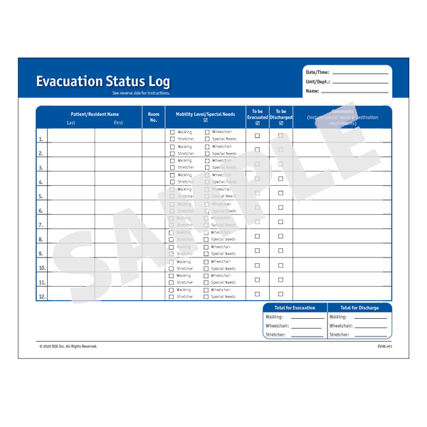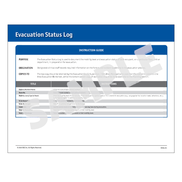 These forms are valuable tools for evacuation leadership as they oversee event progress, document evacuee movement, and log critical recordkeeping data. Proprietary job aides developed by DQE and aligned with the Hospital Incident Command System (HICS) and the Nursing Home Incident Command System (NHICS). Available to restock your PACE Evacuation Toolbox (IC3000) or to add to your own evacuation plan supplies.