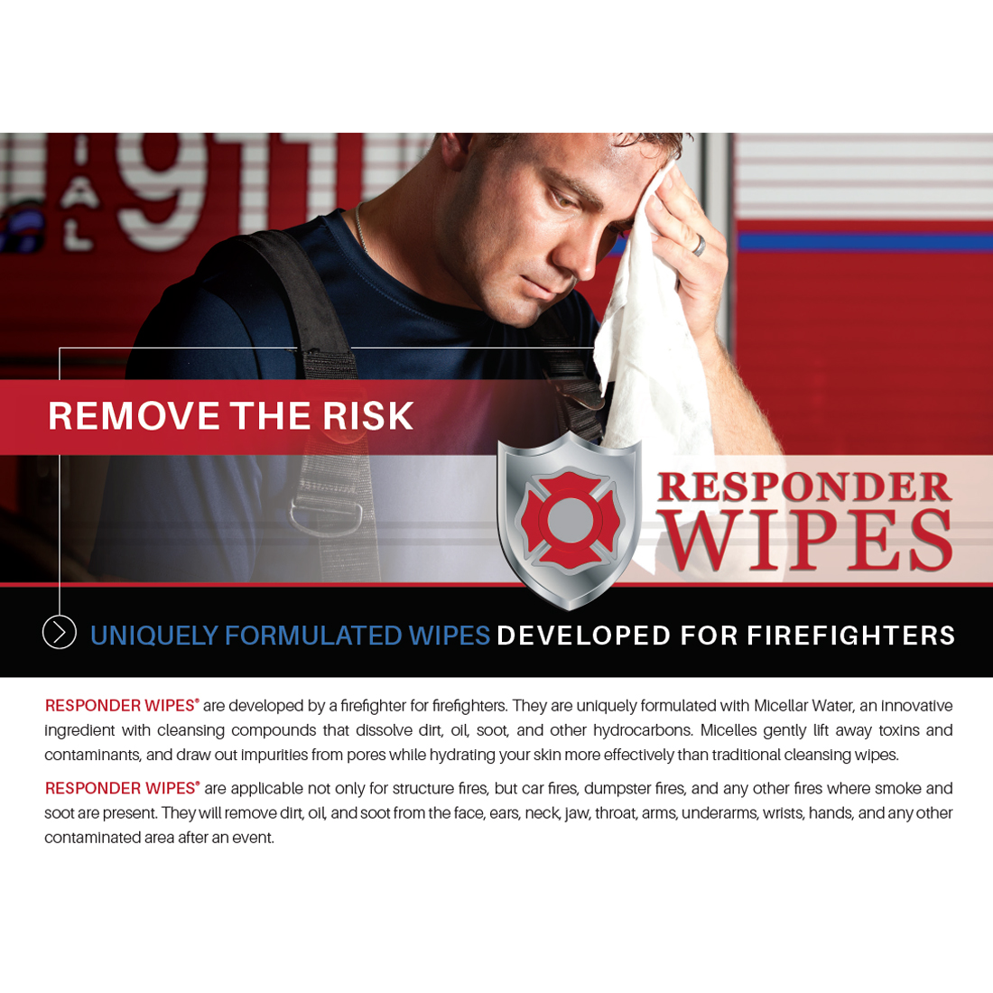 Responder Wipes are developed by a firefighter for firefighters. These firefighter wipes are uniquely formulated with micellar water, an innovative ingredient with cleansing compounds that dissolve dirt, oil, soot, and other toxins and contaminants. Responder Wipes draw out the impurities from your pores while hydrating your skin more effectively than traditional body cleansing wipes.