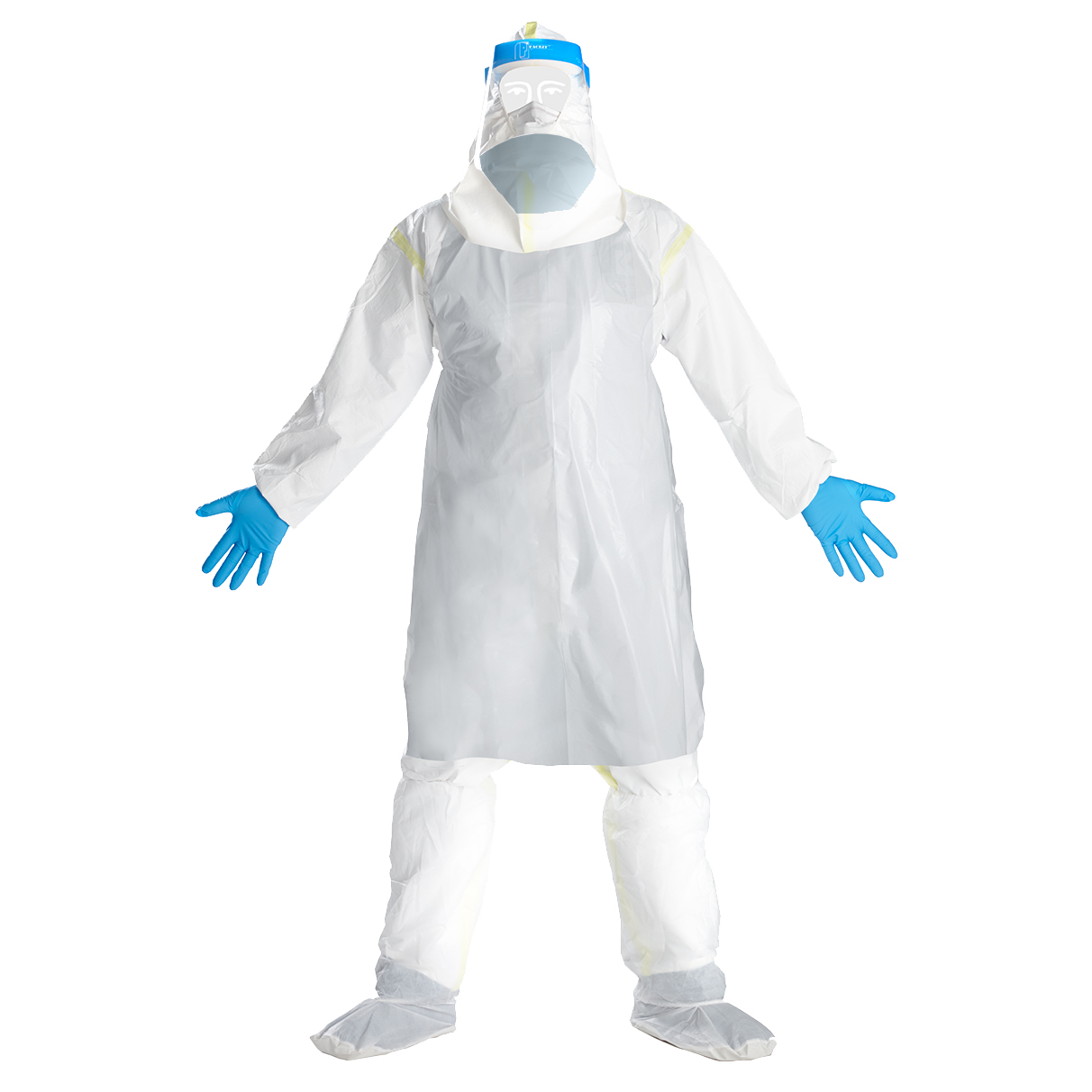 The contents were chosen with special attention to their utility for healthcare workers. For example, the material of the coverall is breathable to be more comfortable while working. Two thicknesses of gloves were chosen, so a heavier glove could be worn as an outer glove. The disposable apron can tear off from your neck for disposal, avoiding the need for having potentially hazardous scissors around to cut the straps.