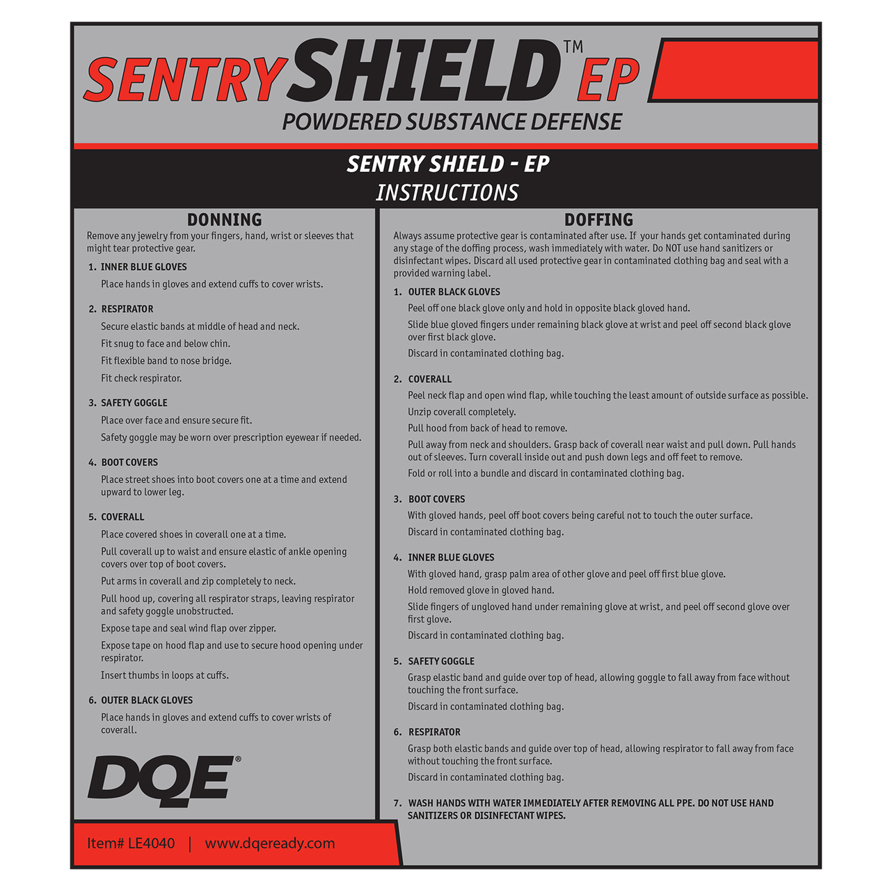 The Sentry Shield EP is an Extra Protection kit that provides increased moderate protection when powdered substance hazards may be present. The full coverall kit with goggles P100 respirator and two pair of nitrile gloves provides the greatest protection of all the Sentry Shield kits. For higher threat levels additional respirator protection may be required.