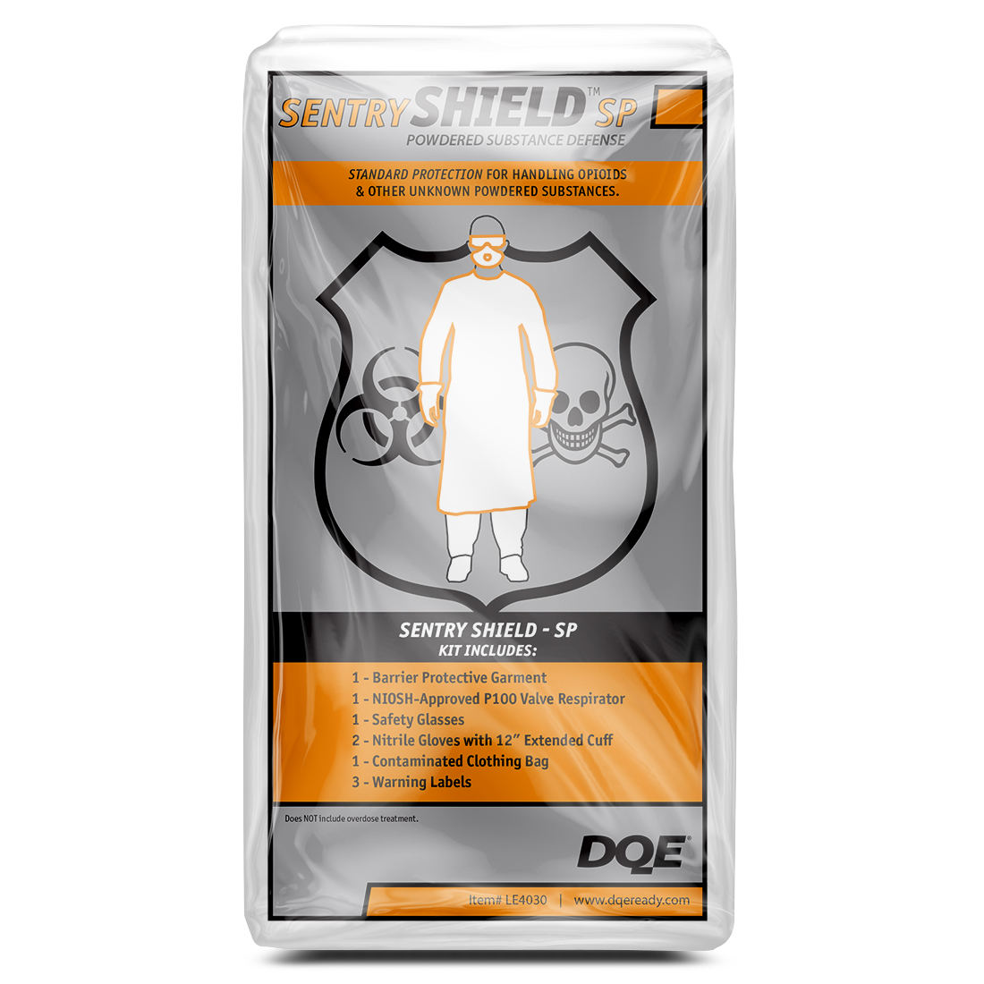 The Sentry Shield line of personal protective kits protects law enforcement officers and first responders from unknown powder substances that could be hazardous like fentanyl, carfentanil, or other powerful opioid-based substances. These personal protection kits range in coverage: Quick Protection (QP), Standard Protection (SP), and Extra Protection (EP) and are based on the severity of exposure levels responders may encounter.
