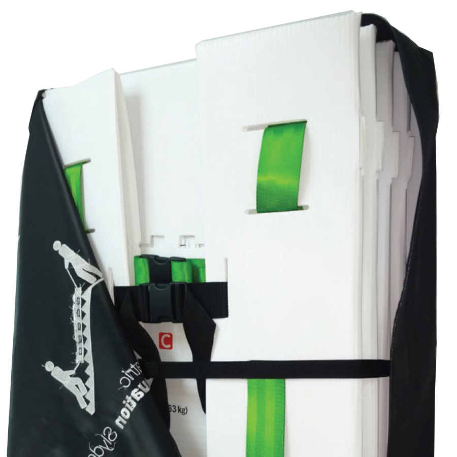 Storage of the Slyde is easy. The Slyde Evacuation Sled folds flat and stores in stacks of five units in a storage sleeve (sold with groups of 5 sleds or sold separately). The sleeve can be wall-mounted with its Velcro straps for quick access in key locations.