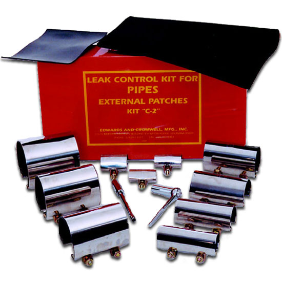 The External Pipe Leak Control Kit “C-2″ by Edwards and Cromwell contains a complete set of external pipe bandages covering nominal pipe sizes from 1/2″ to 4”. This leak control kit can be utilized anywhere there is a pipe or lin: in municipal departments, chemical plants, manufacturing facilities, hospitals, oil field, water and sewer treatment plants.