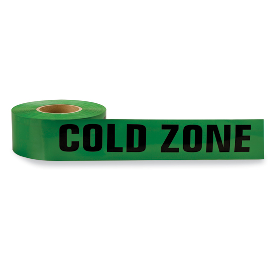 Cold Zone Tape creates a barrier to identify the cold zone in a HazMat event. The cold zone is for rehabilitation (rehab), post-decon treatment, or the command post. The cold zone is an area without any risk that is outside the hot and warm zones, ideally uphill or upwind. Green with “Cold Zone” repeating continuously in bold, black letters.