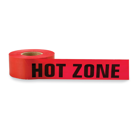 Hot Zone Tape creates a barrier to identify the hot zone in a HazMat event. The hot zone is any contaminated or high-risk area within the immediate perimeter of fire or combustible products (including smoke and soot). Red with “Hot Zone” repeating continuously in bold, black letters.