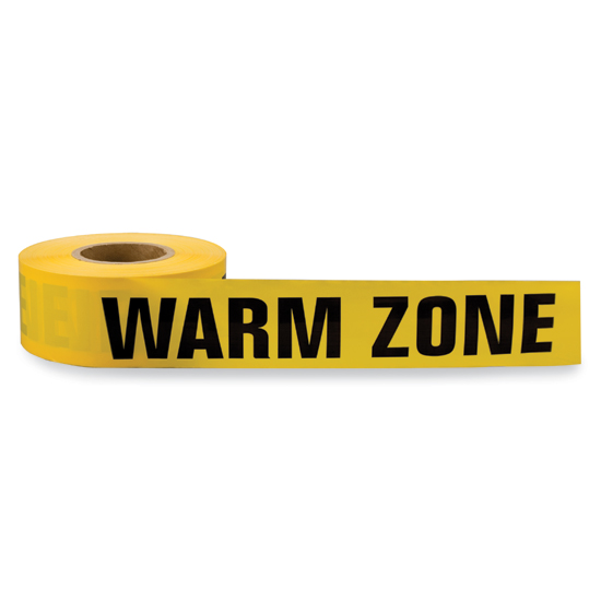 Warm Zone Tape creates a barrier to identify the warm zone in a HazMat event. The decontamination area is in the warm zone. This area is located between the hot and cold zones and not near any fire or products of combustion. Yellow with “Warm Zone” repeating continuously in bold, black letters.
